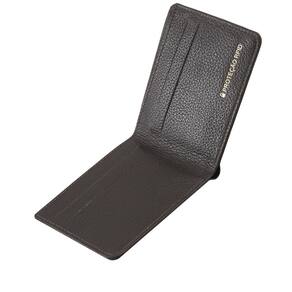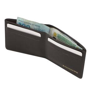 Estrutura do corpo: Construção em couro macio de espessura média e toque macio. Forro misto de poliéster e alumínio com blindagem de leitura Rfid. Logomarca prensada em relevo. Dimensões fechada: 10,5 x 8,5 x 01 cm largura x altura x espessura Dimensões aberta: 21,5 x 8,5 x 01 cm largura x altura x espessura Peso aproximado: 40 gramas Material: couro