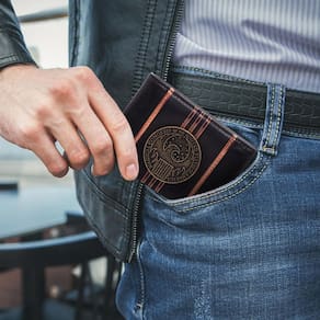 O que está dentro: três bolsos horizontais para cartão, dois bolsos verticais para cartão, uma janela transparente para identidade, um compartimento para moedas de tamanho completo, Congresso mágico dos Estados Unidos da América