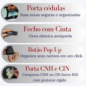 Fecho com cinta antiqueda: Proteção extra contra quedas acidentais, mantendo a carteira sempre fechada.