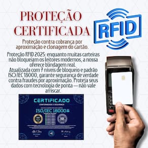 A linha ESSENCIAL une design funcional, materiais resistentes e proteção de verdade. Ideal para quem busca praticidade, segurança e estilo no dia a dia. Destaques da ESSENCIAL: Proteção RFID Atualizada 2025 : Muita gente ainda compra carteira com proteção RFID, mas descobre tarde demais que ela não bloqueia os leitores mais modernos. A nossa, simplesmente funciona. Atualizamos para atender 7 categorias de bloqueio, com padrão ISO/IEC 18000, garantindo proteção real contra fraudes por aproximação. Se é para se proteger, que seja com tecnologia de verdade. Arriscar com modelos ultrapassados pode sair caro. Porta CNH rígido: Documentos protegidos sem risco de dano. Sistema Pop-Up: Acesso rápido e prático a até 6 cartões com apenas um clique. Fecho com cinta antiqueda: Proteção extra contra quedas acidentais, mantendo a carteira sempre fechada. Cinta porta-cédulas reforçada: Nada de plástico frágil - aqui, suas notas ficam bem armazenadas. Produzida no Brasil: Qualidade nacional pensada para o seu dia a dia, com total compatibilidade com nossos documentos.