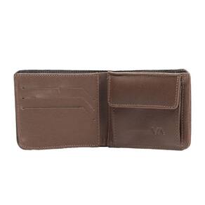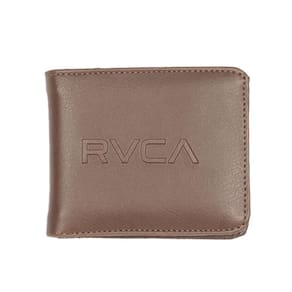 Carteira RVCA de material não natural com duas partes, três compartimentos para cartão, compartimento para dinheiro, bolso interno com lapela e logo RVCA gravado centralizado na frente.