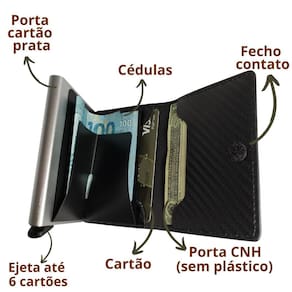 Além dos cartões, nossa carteira comporta sua CNH sem plástico de proteção e possui um porta-cédulas prático para suas notas.