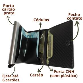 A carteira comporta até 6 cartões com proteção RFID e possui espaço para mais 2 cartões sem essa proteção. Mantenha suas informações pessoais seguras e evite fraudes.