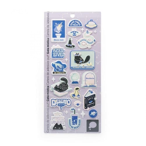 Cartela De Adesivos Puff Gata Mística Se você é fada acessível e adora sair colando adesivo por aí... Dá um look nessa cartela então. Com 19 adesivos, que são doses de realidade, perfeitos pra você que tá ligada nos astros e não pode ver um adesivo por aí dando bobeira que já quer chamar de seu. São vários temas, frases e memes. E se você não entender algum joga na internet né, more. Pra colocar na sua agenda, personalizar a capinha do celular ou dar elogios sinceros pra um certo alguém. Achou incrível? Hmmm, tão prrrrevisível. Referência - PI3750Y Cor - colorido Função - ACESSORIOS DE PAPELARIA Embalagem - polybag e cartão Matéria-prima - papel Informações complementares - contém 1 unidade. Instruções de conservação - limpar somente com pano seco. Teme químicos e abrasivos Exclusivo - IMAGINARIUM
