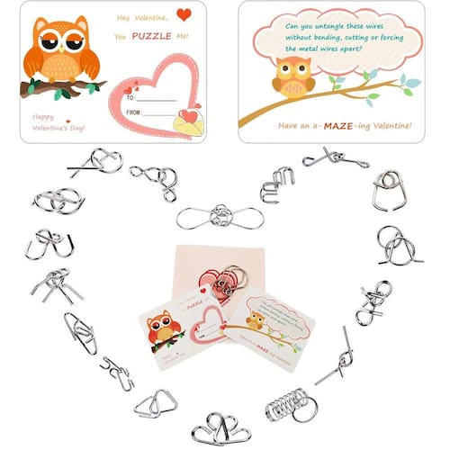 - [Incluir] Este quebra-cabeça de metal inclui 24 quebra-cabeças de arame de metal de estilo diferente. Cada quebra-cabeça de arame metálico tem seu próprio método de jogo. Pacote com 24 peças de quebra-cabeças de arame metálico, 24 peças de cartões de Dia dos Namorados e 24 peças de sacolas de presente pequenas.