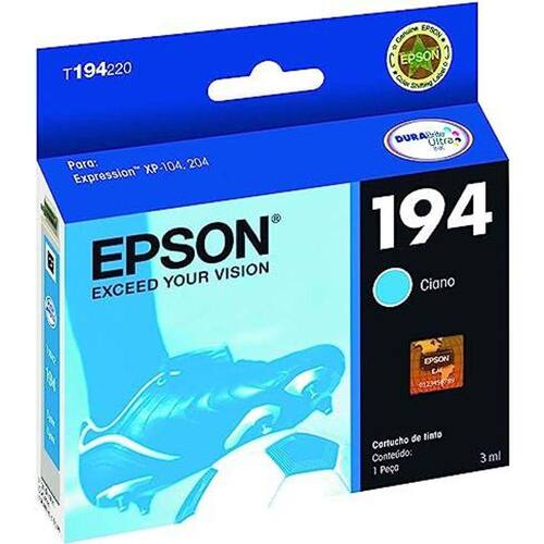 Cartucho de tinta Epson 194 T194220, cor ciano, para impressoras XP204. O cartucho 194 contém 3ml de capacidade e rendimento médio de 150 páginas, com secagem instantânea e resistente à água e borrões.