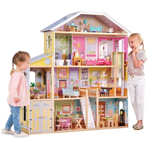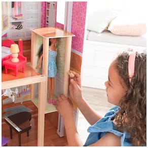 4 níveis e 8 quartos, incluindo berçário no sótão Elevador deslizante vai do segundo ao terceiro andar As portas da garagem abrem e fecham para um jogo realista Feito de madeira para memórias duradouras Serve para todas as bonecas de moda de até Marca: Não Informado