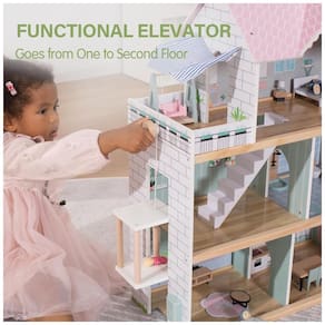 Esta casa de boneca é um conjunto de casa multistória de madeira, mobiliado e com um elevador funcional. Com 5 quartos, varanda e medindo 0,79 metros de altura por 0,61 metros de largura, esta casa é perfeita para bonecas de família com cerca de 12 centímetros de altura. Além disso, a casa pode acomodar móveis com cerca de 18 centímetros de altura da Barbie, HAPE, Calico Critters e Gabby.