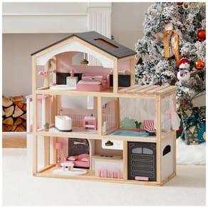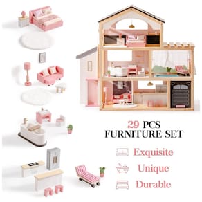 A Casa de Bonecas ROBUD apresenta um elegante telhado preto e uma estrutura de madeira natural, combinando elementos arquitetônicos modernos com detalhes realistas para mostrar o encanto de espaços de vida contemporâneos, dedicados a proporcionar às crianças uma experiência lúdica. Com três níveis, o cenário inclui seis cômodos, como um quarto estiloso e aconchegante, um banheiro adorável, uma piscina confortável, uma sala de estar requintada, uma cozinha aberta e uma garagem, abrangendo diversos aspectos da vida diária e recriando cenas realistas. Detalhes realistas, móveis, padrões de papel de parede delicados, tudo foi cuidadosamente elaborado para criar uma atmosfera realista. As superfícies lisas e sem rebarbas dos móveis garantem elegância e durabilidade, adicionando segurança e qualidade ao tempo de brincadeira das crianças. O design único da piscina e da garagem adicionam luxo e funcionalidade à casa de bonecas, proporcionando mais diversão e interação para aventuras de faz de conta. Este brinquedo de faz de conta dos sonhos é perfeito para se divertir e ideal para várias ocasiões, tornando-se o presente definitivo para suas crianças. Aprimora habilidades linguísticas, estimula a imaginação e a coordenação mãos-olhos, garantindo que seu filho divirta-se. Adequado para bonecas de 46 cm, oferece ainda mais compatibilidade e diversão.
