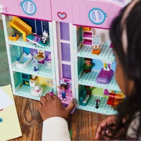 A casa de bonecas Gabby's Dollhouse é composta por 8 quartos coloridos, conectados por um elevador deslizante, garantindo muita diversão em todos os andares. Cada quarto possui atividades divertidas para as crianças explorarem, como cozinhar na cozinha, usar o escorregador na sala de jogos, ser criativo na sala de artes, tocar piano na sala de música, relaxar no banheiro, tirar uma soneca no quarto e até fazer uma refeição no telhado.