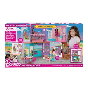 Itens Inclusos - Inclui a Casa de Férias da Barbie, 1 balanço de rede, 1 sofá, 4 cadeiras, 1 mesa de saída, 1 mesa de jantar, 1 lâmpada, 1 planta, 1 toalha, 1 cobertor, 1 escova de dentes, 1 tigela de cachorro, 1 bandeja de cupcake, 1 tigela de pipoca, 1 bolo, 1 caixa de presente, 1 figura de cachorro, 1 jarra de suco, 4 xícaras, 4 pratos, 2 cabides, 1 frigideira e 1 caixa de ovos.