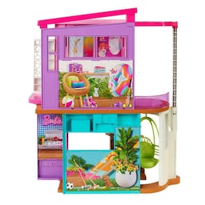 - Quando suas bonecas entrarem nesta casa de boneca de 2 andares da Barbie, descobrirão infinitas possibilidades de diversão com seis áreas de brincadeira, incluindo quarto, banheiro, cozinha, sala de jantar, sala de estar e closet. Esta casa da Barbie abre as portas para contar histórias divertidas com um design moderno e elegante e funcionalidades interessantes, como uma cadeira de balanço que funciona como um elevador e uma parede que vira para cima e para baixo para criar o cenário para uma noite de cinema ou uma festa de aniversário!