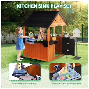 A Casa de Madeira Infantil JOYMOR é perfeita para estimular a imaginação das crianças! Inclui uma casa de madeira, uma pia de brinquedo, uma mesa de piquenique com cadeiras e uma caixa de correio. As crianças de 3 a 8 anos vão adorar criar cenários de brincadeiras ao ar livre. A pia de brinquedo possui um reservatório embutido na parte inferior, e a torneira pode ser acionada manualmente para dispensar água. O interior espaçoso da casa permite que várias crianças brinquem juntas, atendendo às suas necessidades sociais e lúdicas. Os cantos e bordas arredondados garantem a segurança dos pequenos. Feita com madeira de alta qualidade e durável, resistente ao vento, à chuva e à luz solar, esta casa vai acompanhar as crianças por muito tempo, proporcionando uma infância feliz e cheia de diversão.