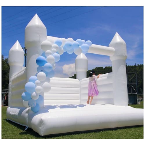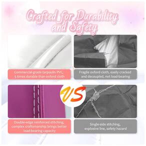 Com dimensões de 4,10m de comprimento, 3,50m de largura e 3,05m de altura, esta grande casa de pula-pula oferece uma ampla área de salto tanto para crianças quanto para adultos, com capacidade máxima de 6 jogadores e peso total de até 204kg. Durabilidade é nossa prioridade ao projetar nossos brinquedos. Esta casa de pula-pula comercial é feita de material PVC durável de 0,45mm, certificado pela CE e ASTM, proporcionando forte capacidade de suporte de peso. Utilizamos técnicas de costura de dupla a quádrupla camada, com 45 pontos por polegada, garantindo qualidade excepcional. O potente soprador, com certificação UL e ETL, infla totalmente o brinquedo em 1 minuto, com 2 grandes aberturas de ventilação com zíperes em ambos os lados para desinflar facilmente. 7 ganchos em arcos na parte superior facilitam a instalação de balões e flores. O pacote inclui 100 balões decorativos. Para garantir a entrega em perfeitas condições, reforçamos a embalagem em camadas duplas e realizamos teste de pressão por 24 horas antes do envio. Consulte o manual de instruções para montagem, armazenamento, manutenção e cuidados.