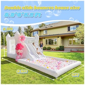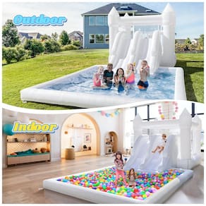 A casa de pulos é feita de materiais oxford seguros e duráveis. A superfície é feita de tecido grosso resistente a perfurações de 480D para um pulo duradouro, combinando técnicas premium de costura para uma estrutura resistente. Além disso, nunca se preocupe com a segurança, pois possui proteção de malha em 3 lados, evitando quedas. ÁREA DE DOBRA DIVERTIDA! A casa de pulos para crianças tem várias áreas de brincadeira, com tobogã duplo permitindo que mais crianças brinquem ao mesmo tempo. A área de pulos traz diversão e exercita a habilidade de pular das crianças, e a piscina de bolinhas permite que se divirtam no colorido mundo das bolinhas. A área de pulos é especialmente projetada com 2 entradas levando ao tobogã e à piscina de bolinhas, tornando fácil para as crianças entrarem e saírem das diferentes áreas de brincadeira. O potente soprador infla o castelo em menos de 2 minutos. Design compacto e dobrável com bolsa de transporte leve permite transições fáceis entre ambientes internos e externos, perfeito para jardins, festas ou salas de brincar. É normal sentir ou ouvir o escape de ar ou ver bolhas na casa de pulos. O vazamento de ar nas costuras é intencional. Isso permite o fluxo contínuo de ar necessário para manter o produto inflado e evita a superinflação. Sua segurança é nossa prioridade! A casa de pulos precisa de um fluxo contínuo de ar para mantê-la inflada, por favor mantenha o soprador ligado durante o uso. Esta fantástica casa branca de pulos na água é adequada para crianças de 3 a 10 anos e possui várias funções para atender a todos os requisitos de diversão no verão. Perfeita para festas de aniversário, eventos de férias e encontros familiares!