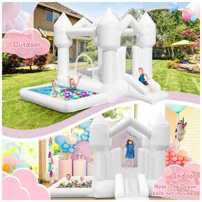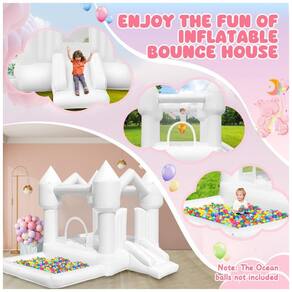 DIVIRTA-SE NA CASA BRANCA! Nossa casa inflável oferece uma área de pulo, escorregador e até uma piscina de bolinhas ao lado. Além disso, incluímos 100 balões para decoração ou diversão das crianças. Aproveite mais tempo de qualidade com seus filhos de forma segura. Feita de tecido Oxford resistente e à prova d'água, com área de pulo cercada por parede de tela para maior segurança. Infla rapidamente com o soprador incluso. Versátil para uso em ambientes internos e externos, sendo perfeita para festas de aniversário, casamentos e reuniões familiares.