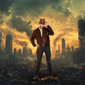 - Casaco marrom desgastado, bolsos frontais com fecho de aba