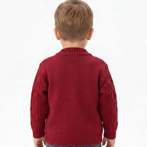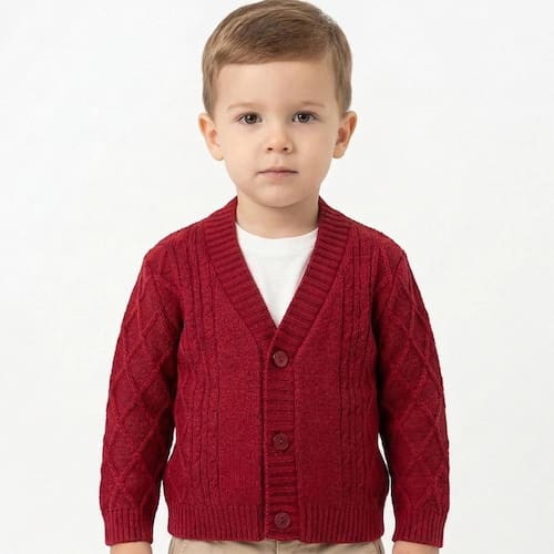 Casaco de Losango Tricô Kids Trança Canelado feito em tecido algodão e acrílico, gola em V, fechamento em botões, manga longa e etiquetas personalizadas.