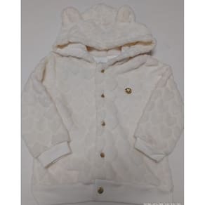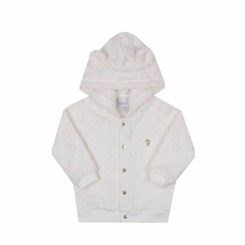 Características do Produto: - Jaqueta / Casaco super macia, quente e confortável. Todo em pelo trabalhado em forma de corações, que vai manter sua pequena super protegida do frio e no maior estilo. Detalhe de plaquinha personalizada da marca aplicada na frente. Possui punhos e barra ribanados. Capuz com orelhinhas em alto relevo, que dão um charme todo especial a peça. Abertura frontal por botões de pressão personalizados da marca. Simplesmente um encanto.
