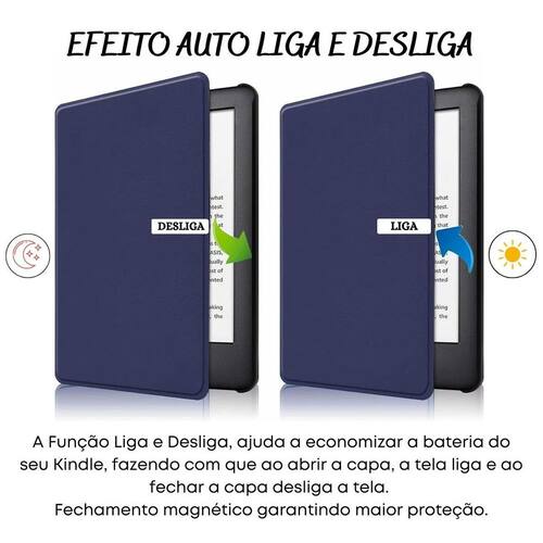 solicitamos que confira o modelo do seu kindle antes de efetuar a compra. Obs: o modelo do kindle se encontra atrás do dispositivo. ------------------ perguntas frequentes ------------------ o modo stand-by precisa ser ativado r: não, ao colocar a capa corretamente no kindle, estará funcionando corretamente, assim que você abre a case a tela liga e ao fechar a tela desliga automaticamente. Quais são os modelos compatíveis r: a case é compatível com o modelo: novo kindle paperwhite 2022 11 geração c2v2l3