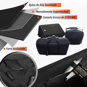 - Alças reforçadas nas laterais para facilitar o transporte com uma ou duas pessoas - Feita em Nylon 800 Rip Stop Prova D'água - Toda Espumada/Almofadada com espuma de 7mm de Ótima Densidade - Forração Interna com tecido aveludado Cinza anti riscos - Abertura com zíper mega resistente - Bolso para carregadores e acessórios - Alças de mão e de Ombro com costuras super reforçadas - Frisos na cor Cinza super modernos - Pezinhos de Plástico para contato com o chão ( Base )