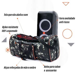 · Produzida com Nylon Impermeável super resistente (Exceto na Tela) · 100% preenchida com espuma 7mm de ótima densidade anti impactos · Forrada internamente com tecido aveludado anti riscos · Possui bolso integrado para cabos e acessórios · Possui alças super-resistentes de mão e de ombro · Projetada para suportar até 28 Kg tranquilamente · Fechamento com zíper de alta qualidade · Tela Frontal que permite a passagem do som e visualização dos jogos de luz da Partybox 100