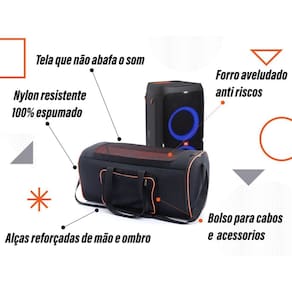 - Possui uma tela frontal que não abafa o som nem esconde as luzes da Caixa de som, permitindo curtir por inteiro sua Partybox - Feita em Nylon 800 Rip Stop Prova D'água - Toda Espumada/Almofadada com espuma de 7mm de Ótima Densidade - Forração Interna com tecido aveludado laranja anti riscos - Abertura com zíper mega resistente - Bolso para carregadores e acessórios - Alças de mão e de Ombro com costuras super reforçadas - Logo moderna exclusiva, criada pelos nossos designers em alto relevo - Frisos na cor Laranja super modernos - Pezinhos de Plástico para contato com o chão ( Base )
