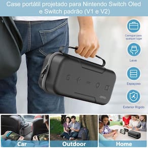 Case Bolsa Nintendo Switch Oled Espaço Carregador OIVO Fantástico case para guardar e transportar o Nintendo Switch OLED ou versão padrão V1/V2. Além de possuir compartimento próprio para o console, também possui local próprio para o carregador e os joypads. Possui ainda espaço para 20 cartuchos de jogos e espaço para outros objetos, como cabos, fones, etc. Conta ainda com zíper duplo e macio. Possui alça de mão confortável e anti-deslizante.