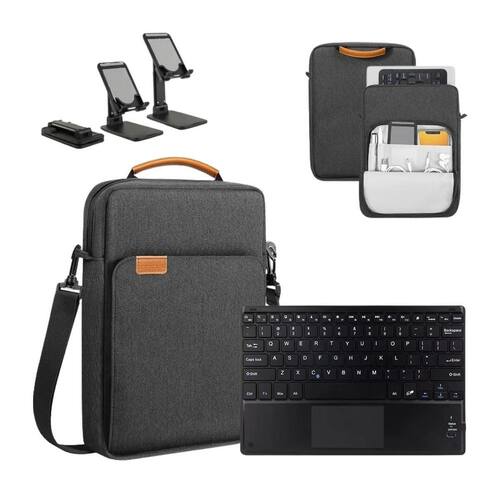 Case com alça + teclado + suporte para tablet s10+ 12.4 x825 Cor: preto O kit 3 em 1 reúne os acessórios ideais para transformar seu tablet ou em uma verdadeira estação de trabalho portátil. Composto por uma case bag transversal, um teclado com touchpad e um suporte universal ajustável, o conjunto é perfeito para quem busca conforto, produtividade e mobilidade no dia a dia. Compatível com tablets e ipads de até 13 polegadas, o kit é ideal para home office, estudos, viagens ou trabalho em movimento. A bolsa possui design moderno e material resistente à água, oferecendo segurança ao transportar seus dispositivos. O teclado bluetooth proporciona digitação fluida e touchpad integrado, enquanto o suporte dobrável garante o ângulo perfeito e uma postura ergonômica durante o uso. Perfeito para quem quer unir estilo, funcionalidade e desempenho em um único kit compacto ------------------ ------------------ O teclado é compatível com qualquer tablet R: sim, o teclado é compatível com tablets e ipads de até 13 polegadas que possuam conexão bluetooth. O teclado tem touchpad integrado R: sim, o teclado possui um touchpad sensível e preciso, permitindo controle total sem precisar de mouse. O suporte é ajustável R: sim, o suporte universal é dobrável e permite ajustar o ângulo de visualização conforme sua necessidade. A bolsa é impermeável R: a case bag possui material resistente à água, ideal para proteger seus equipamentos durante o transporte. A bolsa é impermeável R: a case bag possui material resistente à água, ideal para proteger seus equipamentos durante o transporte. O teclado precisa de pilhas R: não. Ele é recarregável por cabo usb incluso. ------------------ Especificações ------------------ Tipo de conexão: bluetooth Teclado: recarregável via usb Tamanho do teclado: 24cm x 15cm. Tamanho da case bag: 35.5cm x 28cm Compatibilidade: tablets e ipads de até 13 polegadas ------------------ Conteúdo ------------------ 1x case bag transversal 13 1x teclado com touchpad 1x suporte universal ajustável Anúncio referente a kit para tablets e Acessórios e aparelhos que ambientam as fotos não inclusos. ------------------ Apresentação: ------------------ - qualidade garantida. - atendimento qualificado. - enviamos para todo o brasil. - compra garantida. - despachamos em até 1 dia útil após confirmação do pagamento Garantimos a devolução por arrependimento em até 7 dias, após o recebimento e de 15 dias contra defeitos de fabricação. Marca: Não Informado Ean: 7793596876632