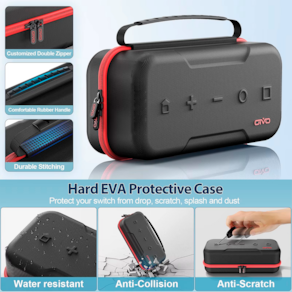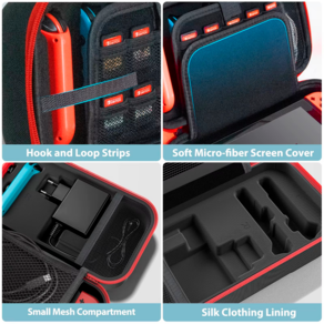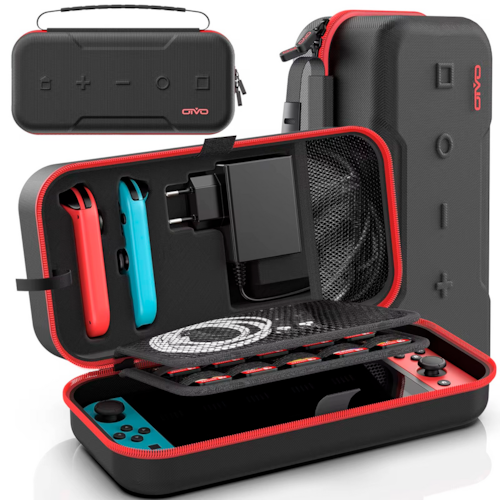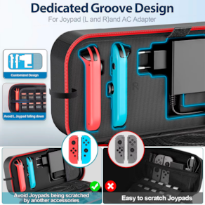 Fantástico case para guardar e transportar o Nintendo Switch OLED ou versão padrão V1/V2. Além de possuir compartimento próprio para o console, também possui local próprio para o carregador e os joypads. Possui ainda espaço para 20 cartuchos de jogos e espaço para outros objetos, como cabos, fones, etc. Conta ainda com zíper duplo e macio. Possui alça de mão confortável e anti-deslizante.