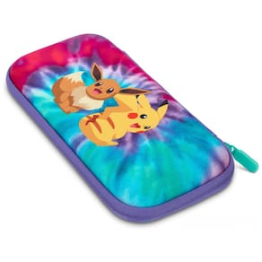 O PowerA Slim Protective Console Case Tie-dye Pikachu & Eevee é uma case rígida fina desenvolvida para proteger o Nintendo Switch em modo portátil, com estampa temática colorida de Pikachu e Eevee em estilo tie-dye. A parte externa traz acabamento resistente com alça de mão e zíper durável, formando uma estrutura firme para transporte em mochilas, bolsas ou na mão, protegendo o console contra arranhões e pequenos impactos.