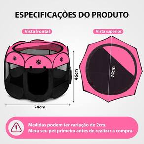 Casinha Cercado Pet Dobrável Portátil Cachorro Gato Rosa Ofereça mais conforto e segurança para seu pet com este prático cercadinho dobrável Ideal para gatos, cães de pequeno e médio porte, coelhos, porquinhos-da-índia e até hamsters, ele é perfeito para momentos de descanso, brincadeiras ou até mesmo viagens. Cores: Rosa-chiclete e preto Amanho montado: 74 cm diâmetro x 46 cm altura Tamanho dobrado: 46 cm x 31 cm x apenas 3 cm de altura - cabe em qualquer cantinho Principais vantagens: Portátil e leve: Dobra facilmente, ideal para transporte e armazenamento. Versátil: Pode ser em casa, quintal, camping ou até mesmo em viagens. Abertura superior e frontal com zíper: Mais praticidade para interagir com seu pet. Tela respirável em todas as laterais: Ventilação garantida e visibilidade total. Material resistente e durável: Estrutura reforçada e tecido lavável. Raças indicadas exemplos : Cães pequenos e médios: Poodle, Shih-tzu, Yorkshire, Maltês, Buldogue Francês, Lhasa Apso, Spitz Alemão Anão , Pug, Dachshund Salsicha , Schnauzer Miniatura. Gatos de todos os portes Coelhos e roedores de médio porte Palavras-chave para busca: Cercado pet portátil; cercadinho para cachorro; cercado dobrável para gato; cercadinho coelho; cercado pequeno porte; casinha de cachorro portátil; cercado para roedores; cercadinho para animais; canil dobrável; cercado desmontável para pets; playpen pets; cercado gatos e cães; viveiro portátil. Marca: Não Informado