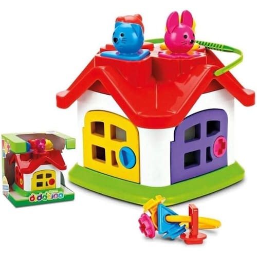 Composta de material super-resistente seus quatro lados são pura diversão. Quatro portinhas que podem ser abertas usando as chaves, que possuem a forma e cor certa que se encaixam na fechadura de cada uma. Os bichinhos são também figuras geométricas que se encaixam nos orifícios do telhado, que quando posicionados corretamente entram na casinha. Ficam esperando que a porta seja aberta para reiniciar a diversão! E agora? Qual será a chave? Um jeito de aprender brincando! Cores e formas sendo usadas de maneira lúdica. Bichinhos que encaixam, cores e formas geométricas.
