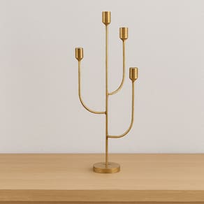 Com design contemporâneo e formato que remete à silhueta de um cacto, este castiçal em metal é uma peça de destaque para composições sofisticadas. Seu acabamento dourado escovado traz elegância e um toque de personalidade para a decoração, ideal para ambientes como salas, halls e aparadores.
