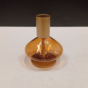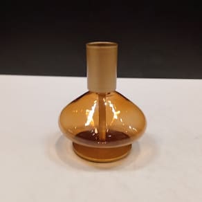 CASTIÇAL Altura: 8,5 cm Largura: 7 cm Profundidade: 7 cm Peso: 0,79 Kg Diâmetro da Base: 5,5 cm Diâmetro do Topo: 2,5 cm Material: Vidro Cor: Âmbar