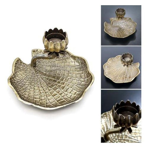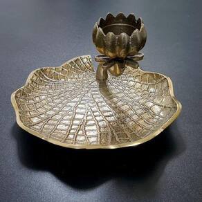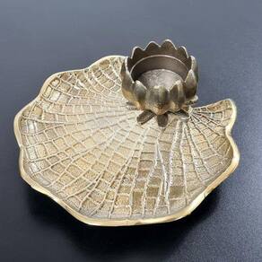 Em dourado envelhecido, feito de alumínio, no design de uma travessa em formato folha e equipado com um suporte no formato de uma flor