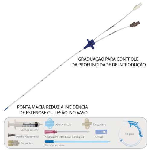 – Cateter termossensível que adquire maior maleabilidade após a introdução, ficando menos propenso à dobras e aumentando o conforto ao paciente; – Ponta macia que reduz a incidência de estenose ou lesão do vaso; – Superfície lisa e regular que diminui a agregação de plaquetas; – Abas para sutura que permitem fixação segura e melhor estabilidade no ponto de fixação; – Introdução com técnica de “Seldinger”.