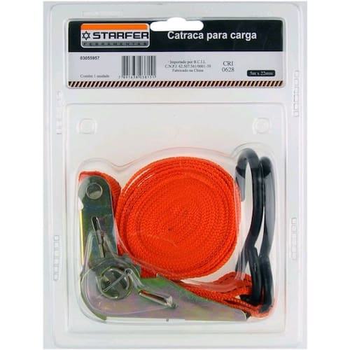 Catraca para carga Starfer 5 metros é um prendedor de carga com catraca, indicado para amarração de motos, jet -ski, lanchas, karts, etc. Capacidade de carga: 100Kg amarração no entanto o uso é imobilização de carga amarração e não elevação Ean: 7891638038151
