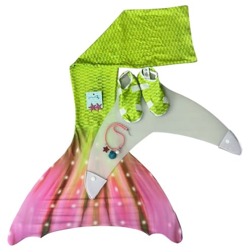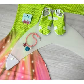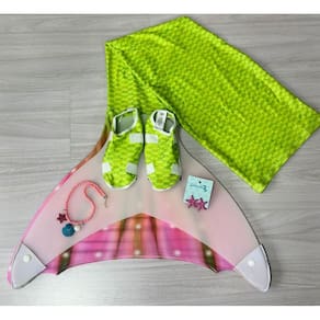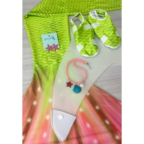 • As caudas são indicadas para crianças acima de 7 anos que já nadam muito bem, acompanhadas de um adulto. • Informações de segurança constam no manual que acompanha a cauda. • O kit contém uma cauda de lycra, biquíni completo e nadadeira básica exclusiva e patenteada Sirenita® com sapatilha regulável. • Composição da Cauda de Sereia: 90% Poliéster 10% Elastano / Composição do forro: 100% poliamida