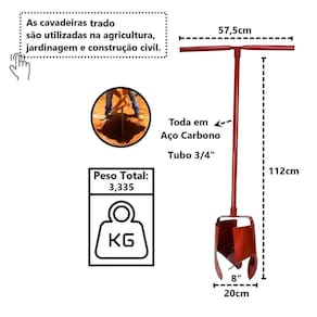 Cavadeira Trado Cabo em Tubo Aço Carbono 08pol 112cm, a cavadeira trado é uma ferramenta indispensável ??para abrir buracos, transplantar plantas, colocar postes, abrir valas para canos ou cavar e retirar a terra sem grande esforço. Tem por finalidade a coleta de amostras deformadas, determinação de profundidade do nível d'água e identificação dos horizontes do terreno.