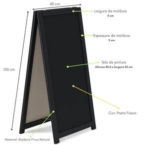 Destaque promoções, cardápios e mensagens com elegância e praticidade! O Cavalete de Calçada Standard é a solução ideal para bares, restaurantes, cafeterias, padarias, lanchonetes, supermercados, açougues e comércios em geral. Sua moldura em madeira MDF preto combina perfeitamente com ambientes rústicos, enquanto o quadro preto fosco realça a escrita com giz branco ou colorido.