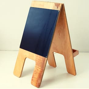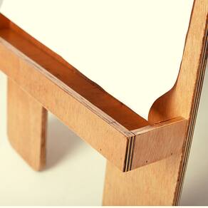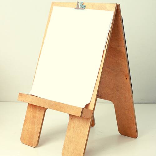 É feito de compensado naval , sendo que de um lado é um espaço que permite colocar folhas de papel sulfite ou kraft para que a criança solte a sua imaginação com os mais diversos materiais: tinta, giz de cera, canetinhas e outros recursos da própria natureza. Do outro, um tela preta semlhante ao quadro negro, permitindo que ela utilize o recurso do giz.