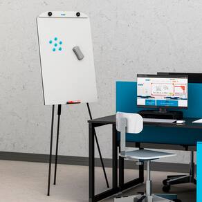 Sua tela é feita de chapa de fibra e madeira MDF com acabamento em pintura 100% UV, ideal para uso de marcador de quadro branco e possui um porta-bloco para bloco de papel de Flip Chart e porta-caneta/apagador injetado em plástico.