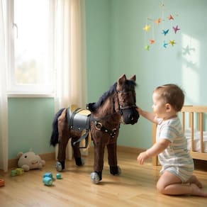 Cavalinho de Rodinha Fabricado em madeira reflorestada e revestido com pelúcia, o nosso cavalinho possui detalhes encantadores: acessórios no peitoral, rédeas, suporte de mãos na sela Todos os tecidos utilizados são antialérgicos, garantindo mais segurança e tranquilidade para os pais e muito mais conforto para as crianças Ele também contribui para o desenvolvimento e o equilíbrio do seu filho. Todos nós queremos crianças saudáveis e fortes e nada melhor do que alcançar isso com muita diversão Produto certificado pelo Inmetro e com O melhor investimento para o desenvolvimento e diversão do seus filhos. Nosso produto é exclusivo e apenas algumas unidades estão disponíveis. Caso não fique satisfeito com o produto, oferecemos uma de 60 dias para devolução e ressarcimento do valor pago Este produto tem todas as características que você deseja. Caso tenha algum problema para usar o produto é só entrar em contato conosco que um consultor irá te atender prontamente. Comece a criar memórias inesquecíveis nos seus filhos, dê presentes que eles realmente gostam Venha conhecer Nossa Linha de Brinquedos Tamanho e dimensões do cavalinho: 56 cm de altura 56 cm de comprimento Para crianças de 1 a 6 anos Cavalinho de Rodinha Os acessórios podem variar as cores por ser um produto artesanal Pelúcia Anti alérgica. Aproveitem o preço promocional de lançamento Atenção : O estribo onde se coloca o pé e somente para deixar o brinquedo realista, ele não suporta o peso da criança para subir no cavalo, tornando uma decoração do cavalo Quem viu este produto também comprou Homologação Inmetro: IP-BRI-9333/2018-13