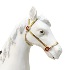 O Cavalo de Balanço Natalino em Resina é um clássico que adiciona charme e nostalgia à decoração de fim de ano. Com acabamento detalhado, o cavalo branco possui sela em tom vermelho, delicados sinos dourados e base em estilo antigo. A árvore de Natal com presentes na parte inferior complementa o visual encantador.