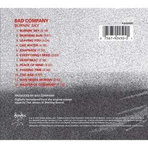 Cd bad company - burnin' sky Produto nacional - embalagem em jewelbox caixa acrílica + encarte com 4 páginas sem as letras das músicas + slipcase luva especial - lançamento mundial 03/03/1977 O quarto álbum de estúdio da banda, foi gravado na frança no château d'hérouville, em julho e agosto de 1976. Com o engenheiro de som, chris kimsey que se tornou o engenheiro de som do rolling stones. O álbum foi remasterizado e relançado em 1994, a capa é semelhante ao poster do filme de sam pechinpah the wild bunch, de 1969. No filme almost famous de 2000, a primeira camiseta da banda fictícia stillwater é muito semelhante a capa do álbum birnin' sky. Tracklist: 01 - burnin' sky 05:19 02 - morning sun 03:57 03 - leaving you 03:24 04 - like water 04:18 05 - knapsack 01:20 06 - everything i need 03:22 07 - heartbeat 02:38 08 - peace of mind 03:22 09 - passing time 02:30 10 - too bad 03:37 11 - man needs woman 03:48 12 - master of ceremony 07:10 Marca: Não Informado Ean: 0075679245021