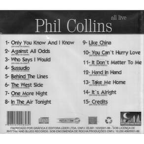 CD Phil Collins All Live Ficha Técnica Ano de Lançamento: 2012 Classificação Indicativa: Livre Nome do Artista: Phil Collins Quantidade de Discos: 1 Quantidade de Músicas: 15 Tipo de Mídia: CD Título: Phill Collins All Live Faixas: 1. Only You Know And I Know 2. Against All Odds 3. Who Says I Would 4. Sussudio 5. Behind The Lines 6. The West Side 7. One More Night 8. In The Air Tonight 9. Like China 10. You Cant Hurry Love 11. It Dont Matter To Me 12. Hand In Hand 13. Take Me Home 14. Its Alright 15. Credits Ean: 7898024208532