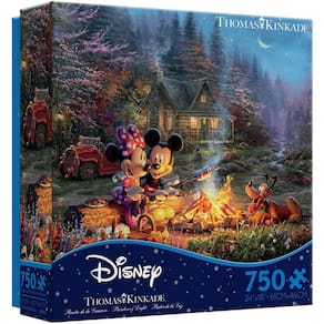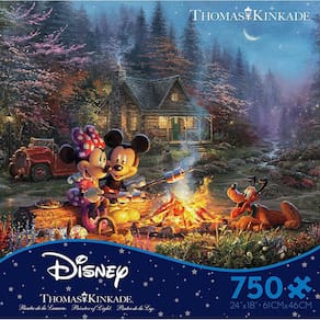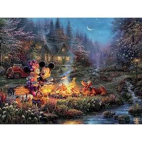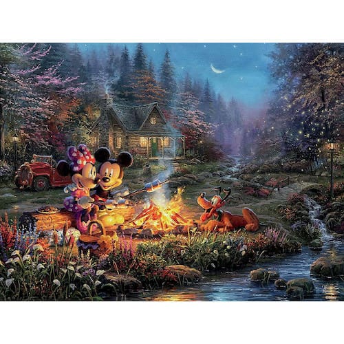 Thomas Kinkade captura a magia atemporal das histórias clássicas da Disney e seus personagens cativantes através do estilo de "panoramas narrativos". cada pintura conta toda a história de um filme da Disney em uma imagem, inspirando-se na arte, esboços e outros documentos históricos dos arquivos da Disney. Esta obra vem em um quebra-cabeça de 750 peças de Ceaco com os personagens da Disney Mickey e Minnie Mouse. É feito nos EUA. E quando concluída, mede 24 polegadas x 18 polegadas.