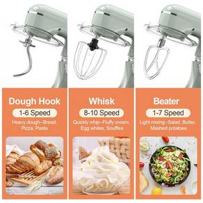 O conjunto de acessórios inclui gancho para massas, batedor e fouet, cobrindo etapas de sova, mistura e aeração de ingredientes em diferentes densidades. O controle de velocidade por botão giratório, complementado pela função de pulso, facilita o ajuste entre agitação suave e mistura em alta rotação, adequado para incorporar ingredientes secos, bater claras e homogeneizar massas mais pesadas.