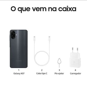 O Galaxy A07 chega para redefinir o que voce espera de um smartphone feito para durar, entregando o melhor processador da categoria, camera dupla de ate 50MP, ate 6 atualizacoes de Android e ate seis anos de atualizacoes de seguranca, protecao IP54 contra agua e poeira, design fino e recursos que acompanham seu ritmo.